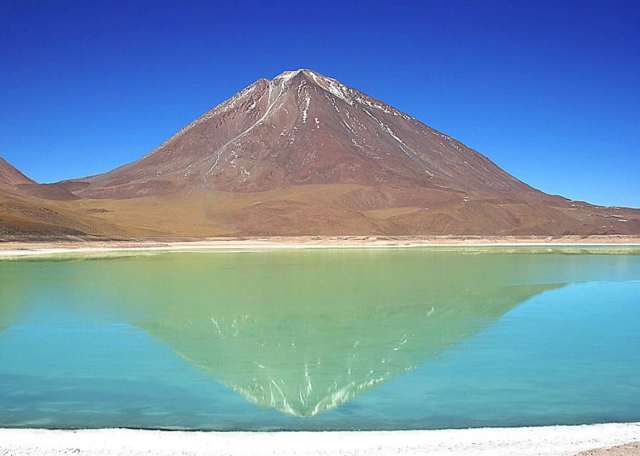 El Volcan Licancabur se ubica en la forntera con Bolivia y se puede ver a lo lejos desde San Pedro de Atacama.